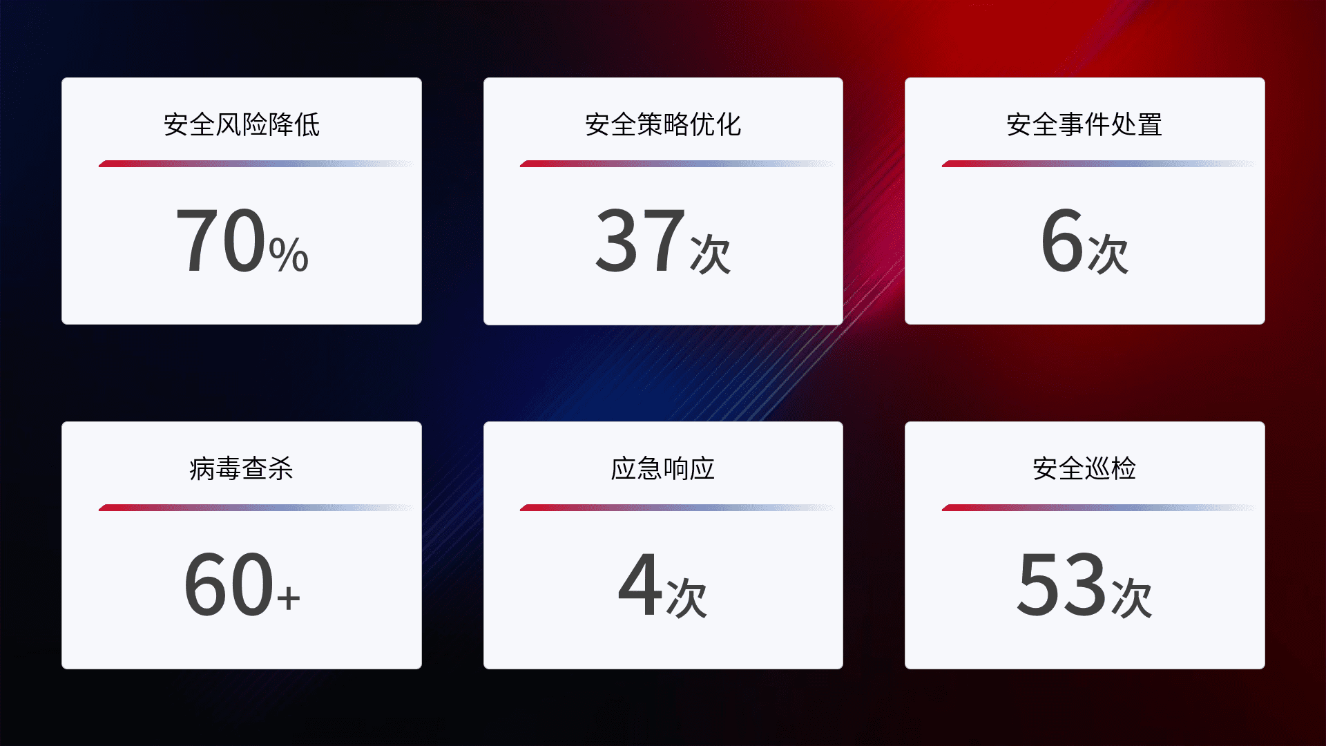提供全面的安全事件报告体系,,,,包括处置报告、、、周报、、、季度和年度总结,,,,结合持续监控,,帮助客户深入了解网络安全状况。。