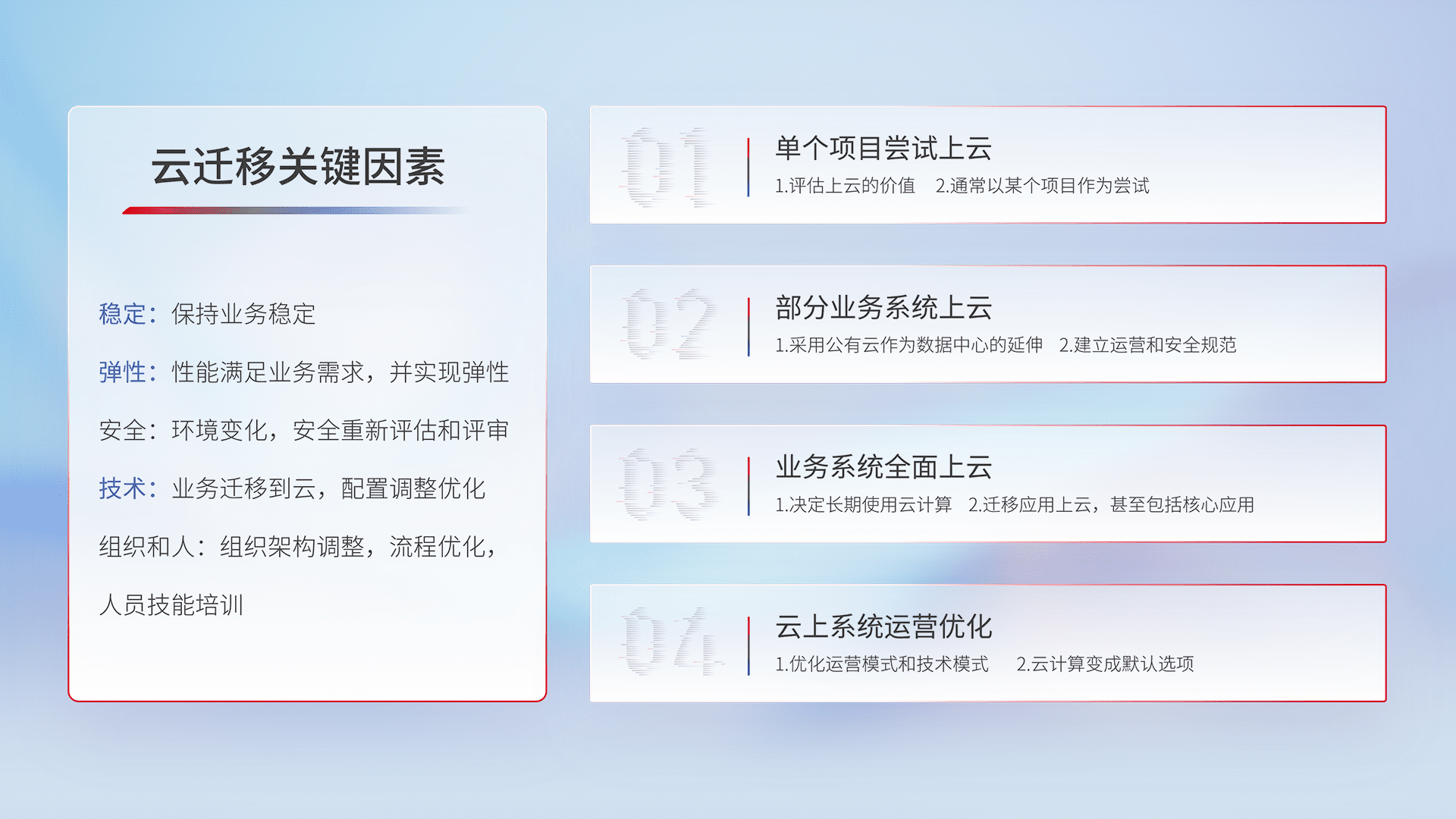 结合实际业务,,,,从规划设计、、云平台选型、、、、云原生改造、、、数据迁移、、集成交付,,迁移全过程为客户识别最佳上云路径,,做好风险识别管理,,设计网络架构、、、身份权限、、、、安全审计合规、、操作审计、、、日志审计、、监控告警策略、、多站点容灾设计等,,,,对云上基础设施进行整体规划,,提升IT治理水平,,以满足弹性、、高可用、、、高性能的需求。。。。